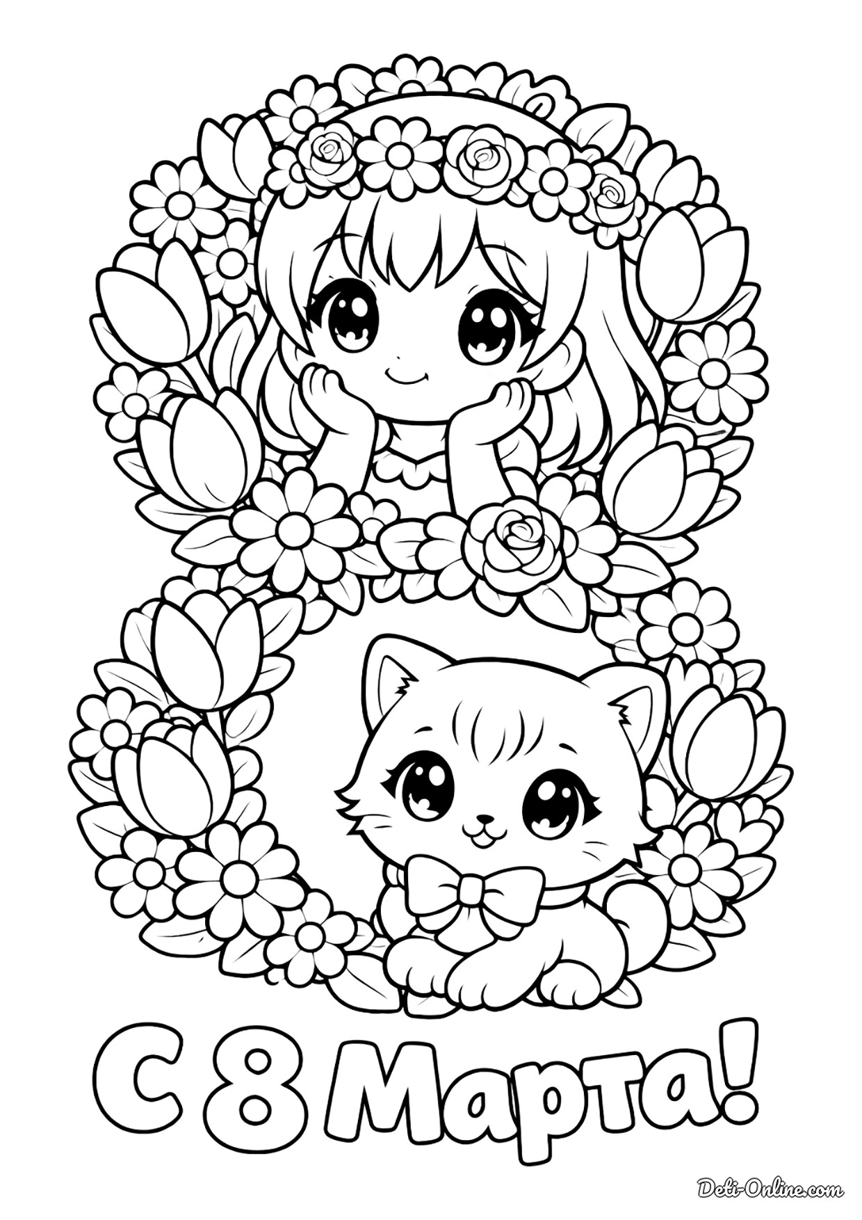 Раскраска «Девочка и котик на 8 марта»