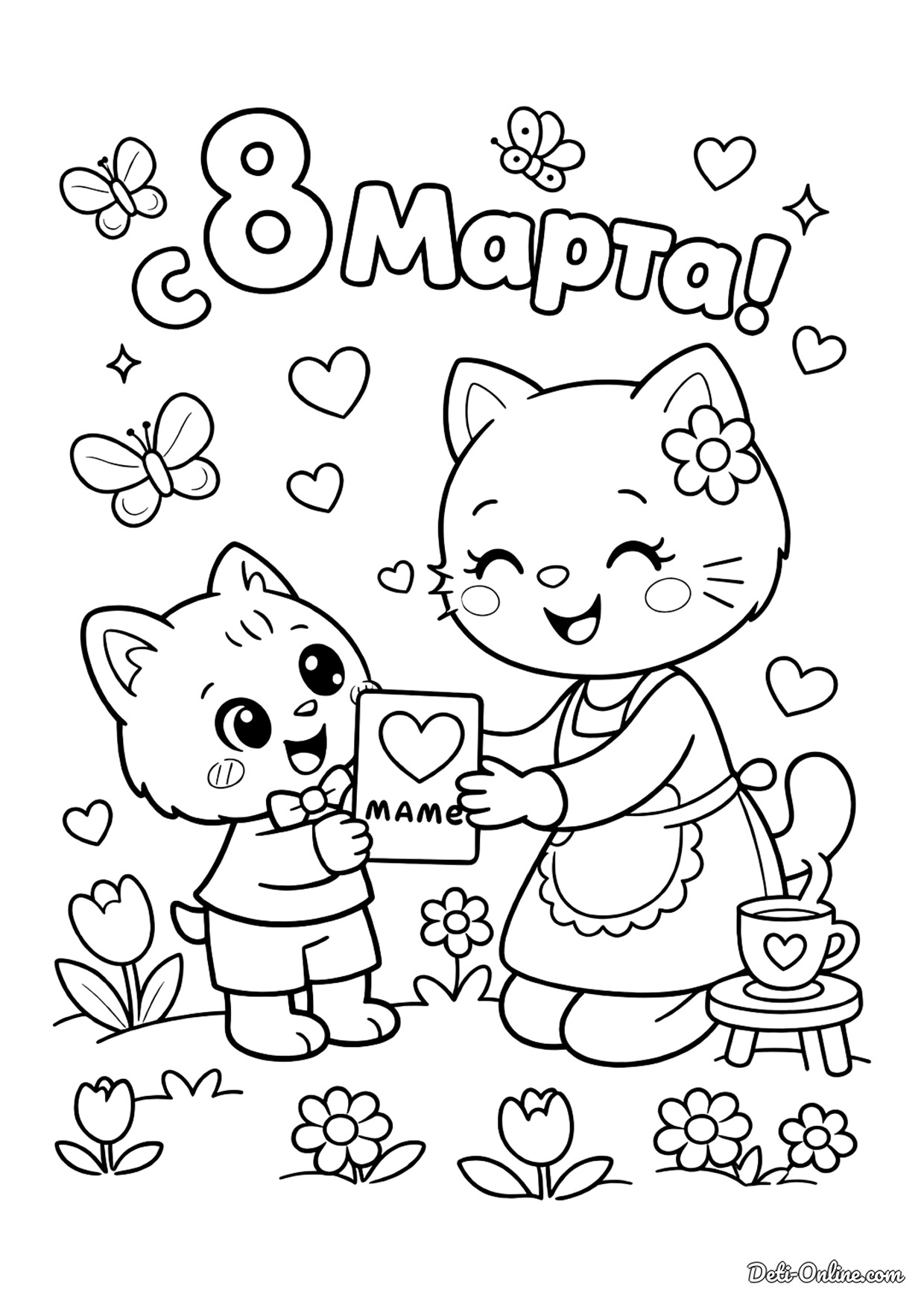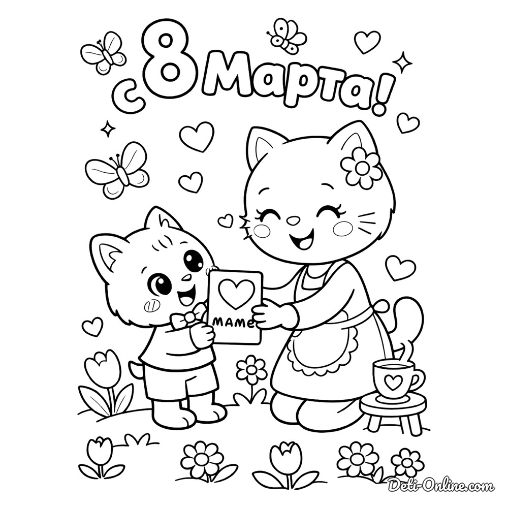 Раскраска «Котёнок дарит открытку маме на 8 марта»