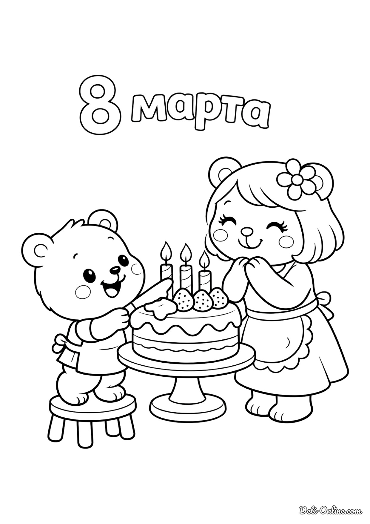 Раскраска «Медвежонок дарит тортик маме на 8 марта»