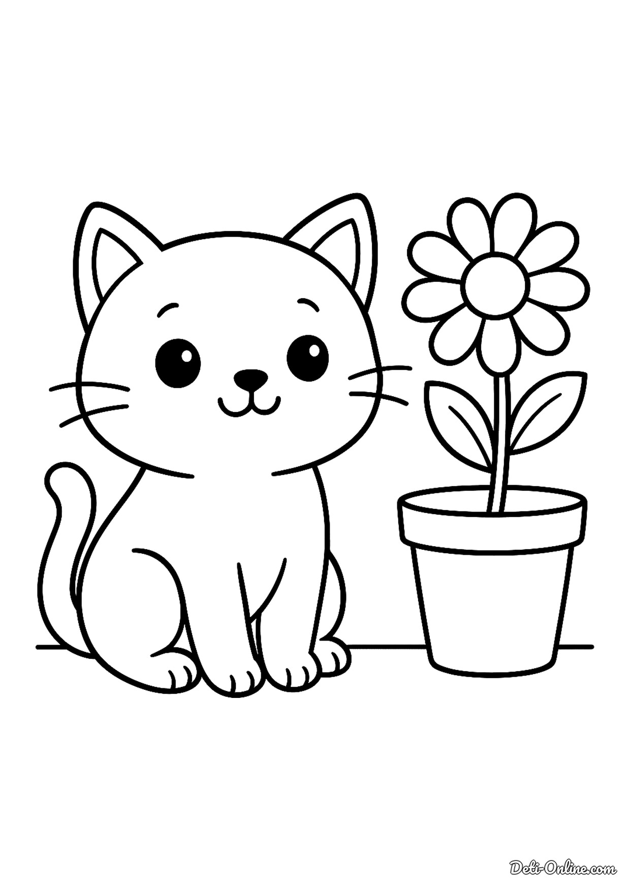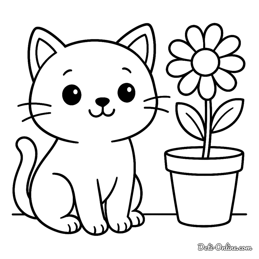 Раскраска Кот и ромашка в горшке