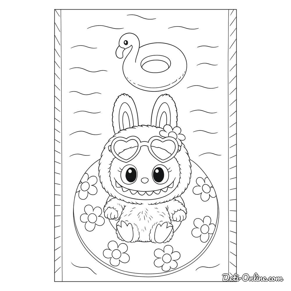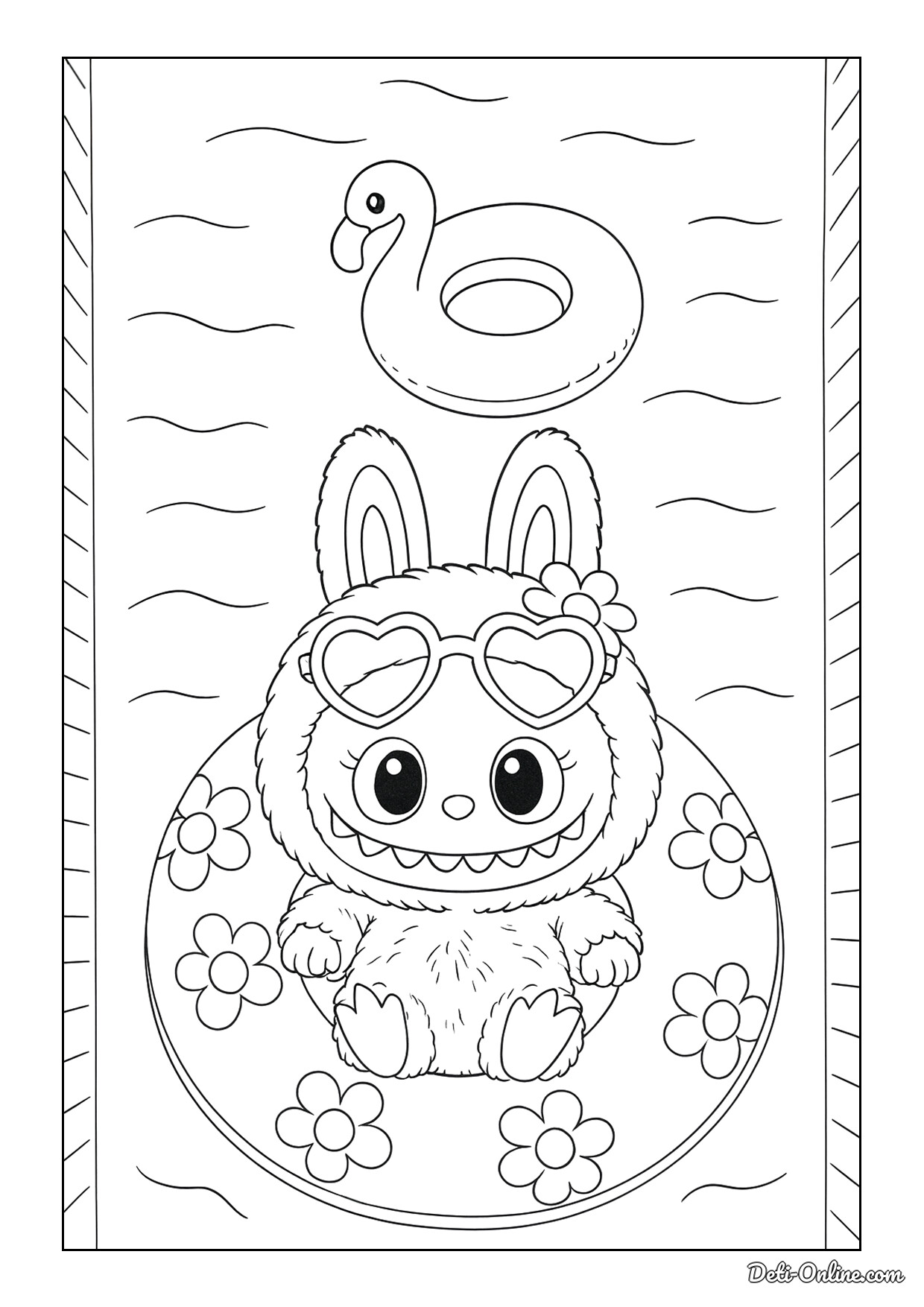 Раскраска «Лабубу в бассейне с надувным фламинго»