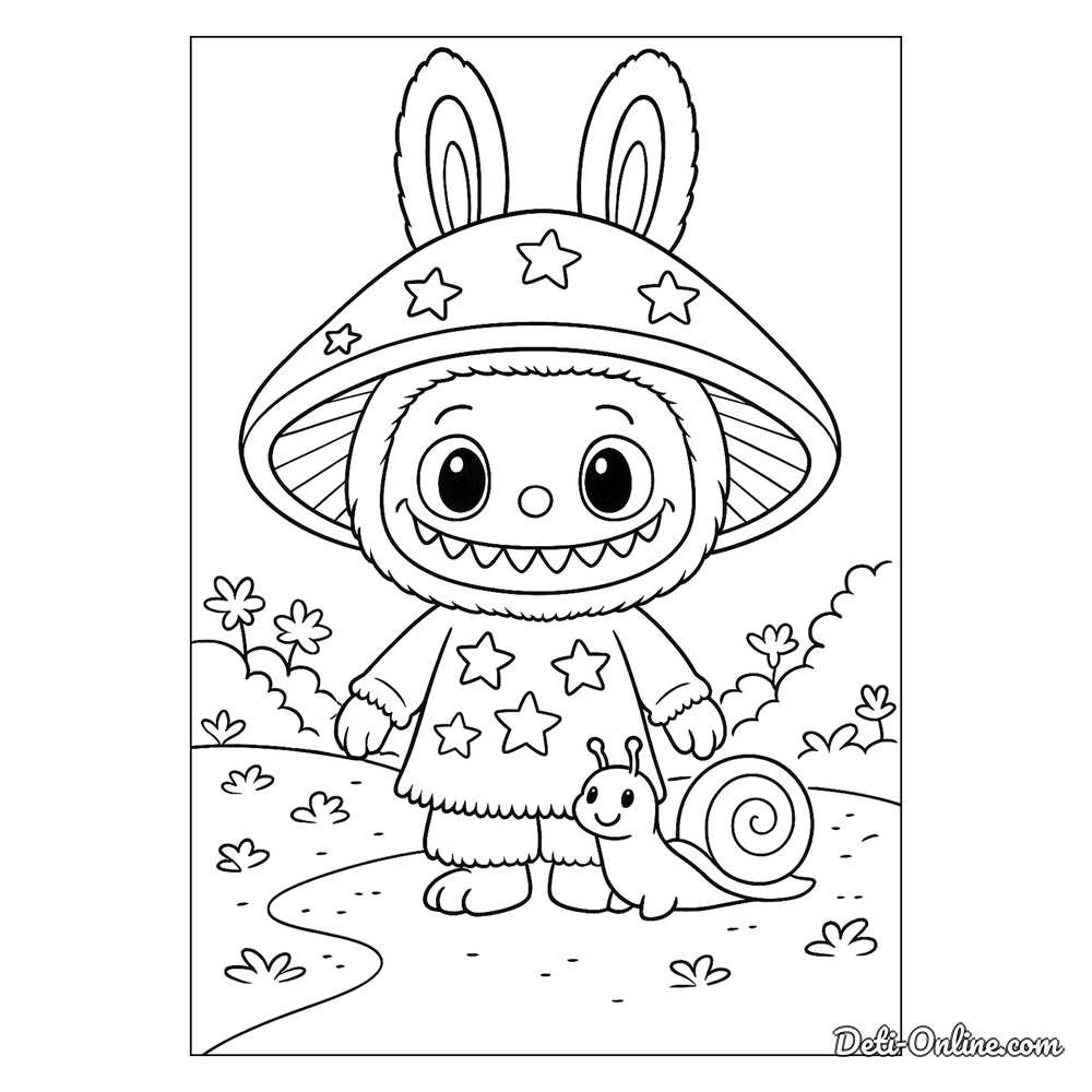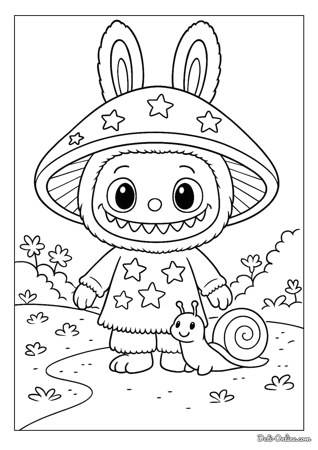 Раскраска «Лабубу в шапке-грибе с улиткой»