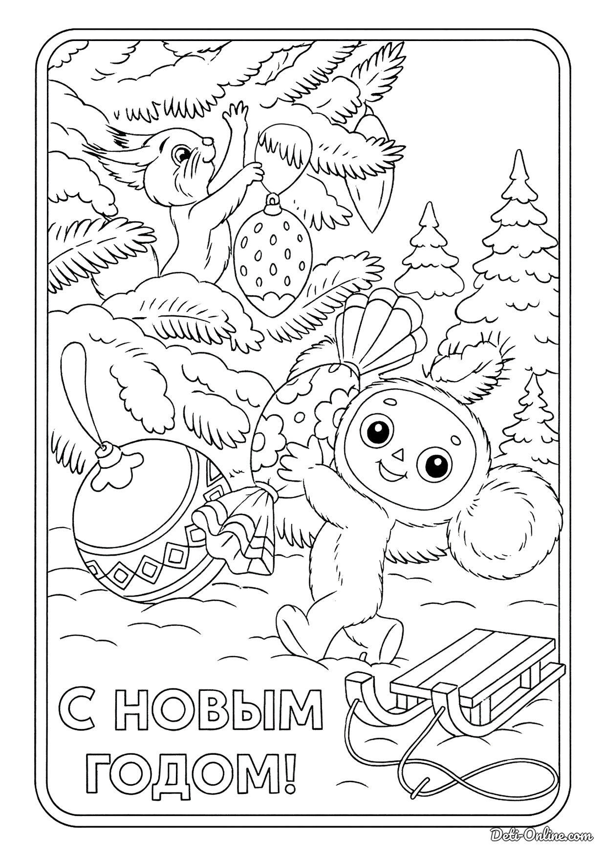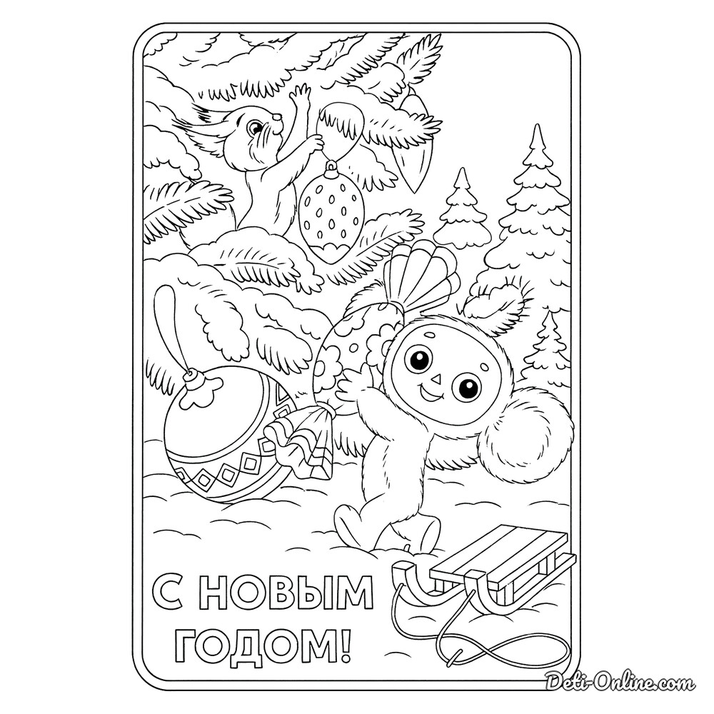 Раскраска «Чебурашка и белочка украшают ёлку»
