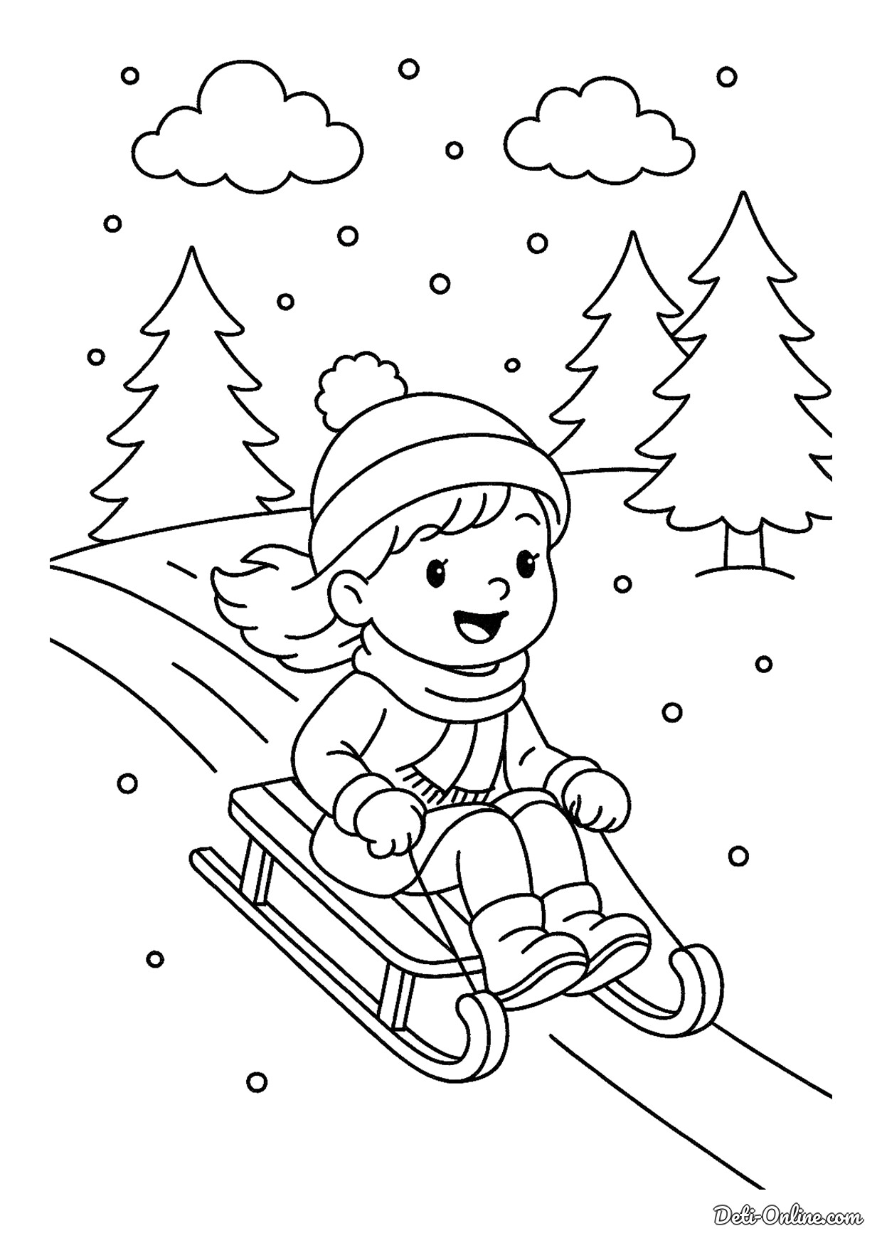 Раскраска «Девочка на санках в лесу»