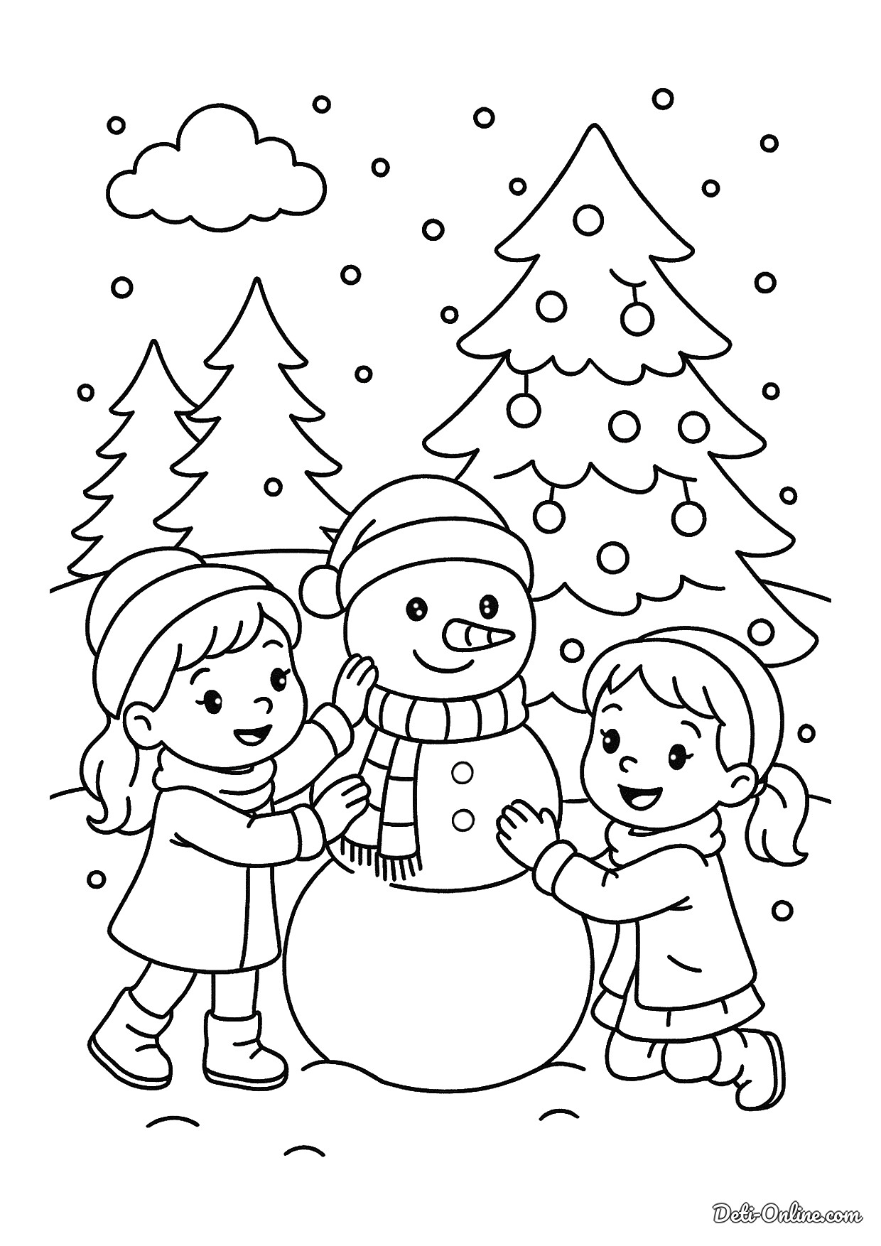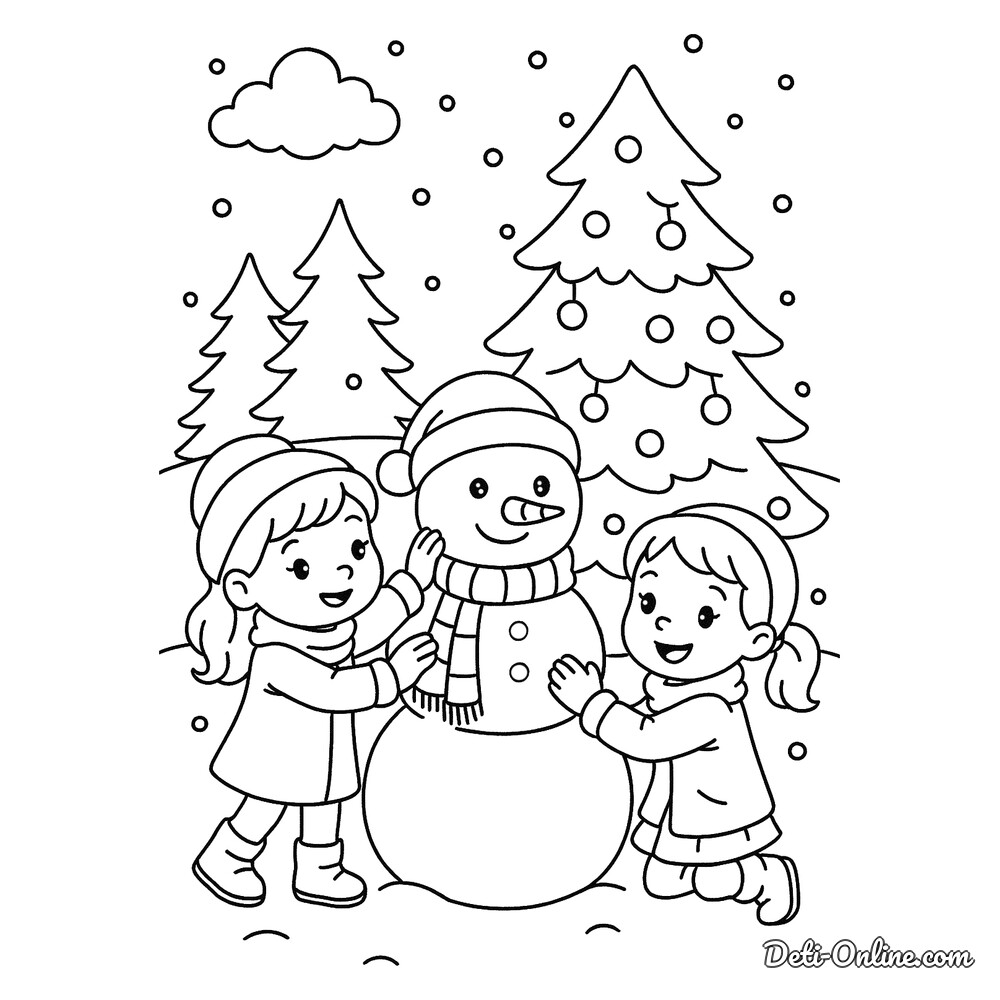 Раскраска «Девочки лепят снеговика»