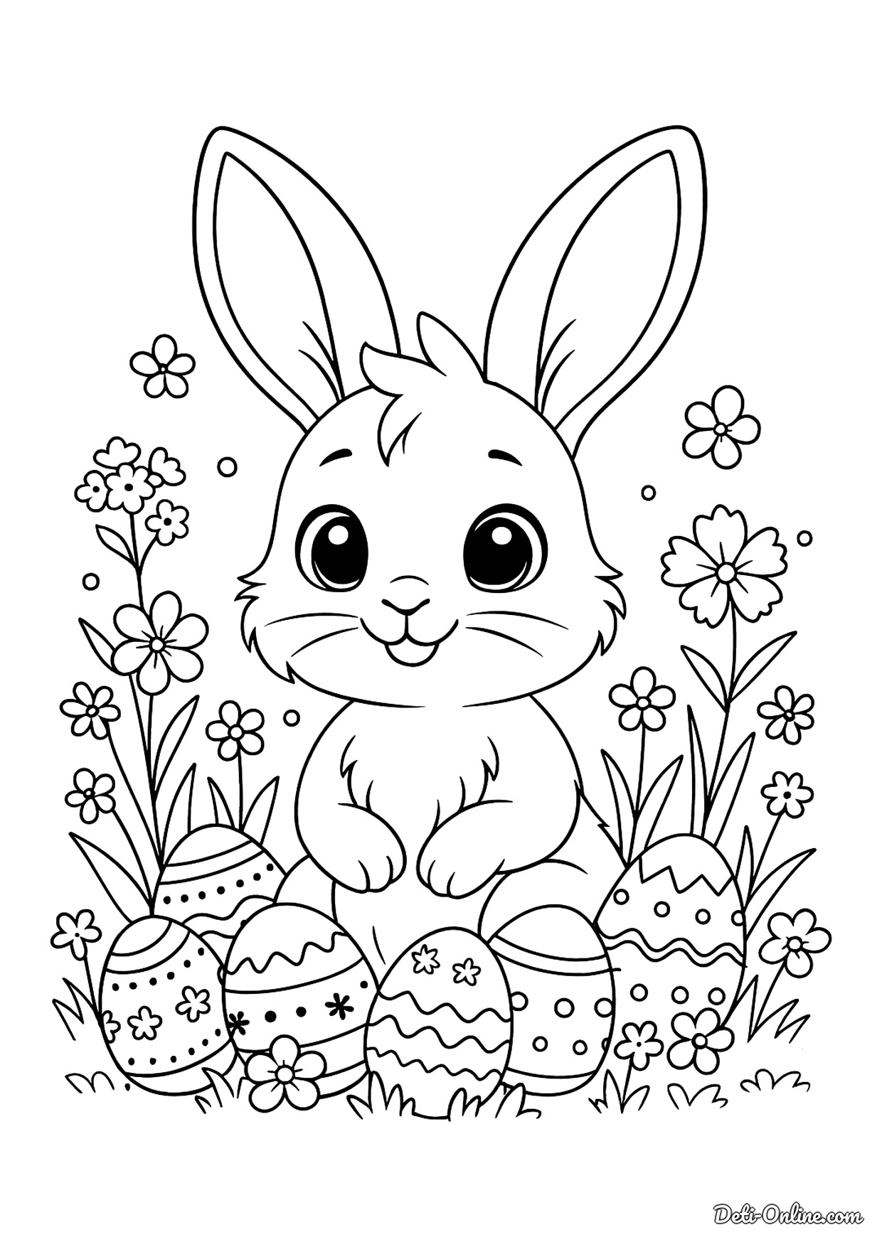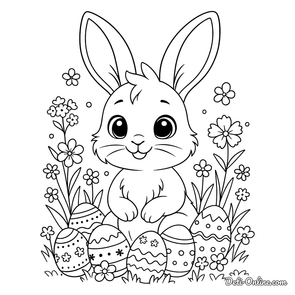 Раскраска «Милый зайчик в кустах с пасхальными яйцами»