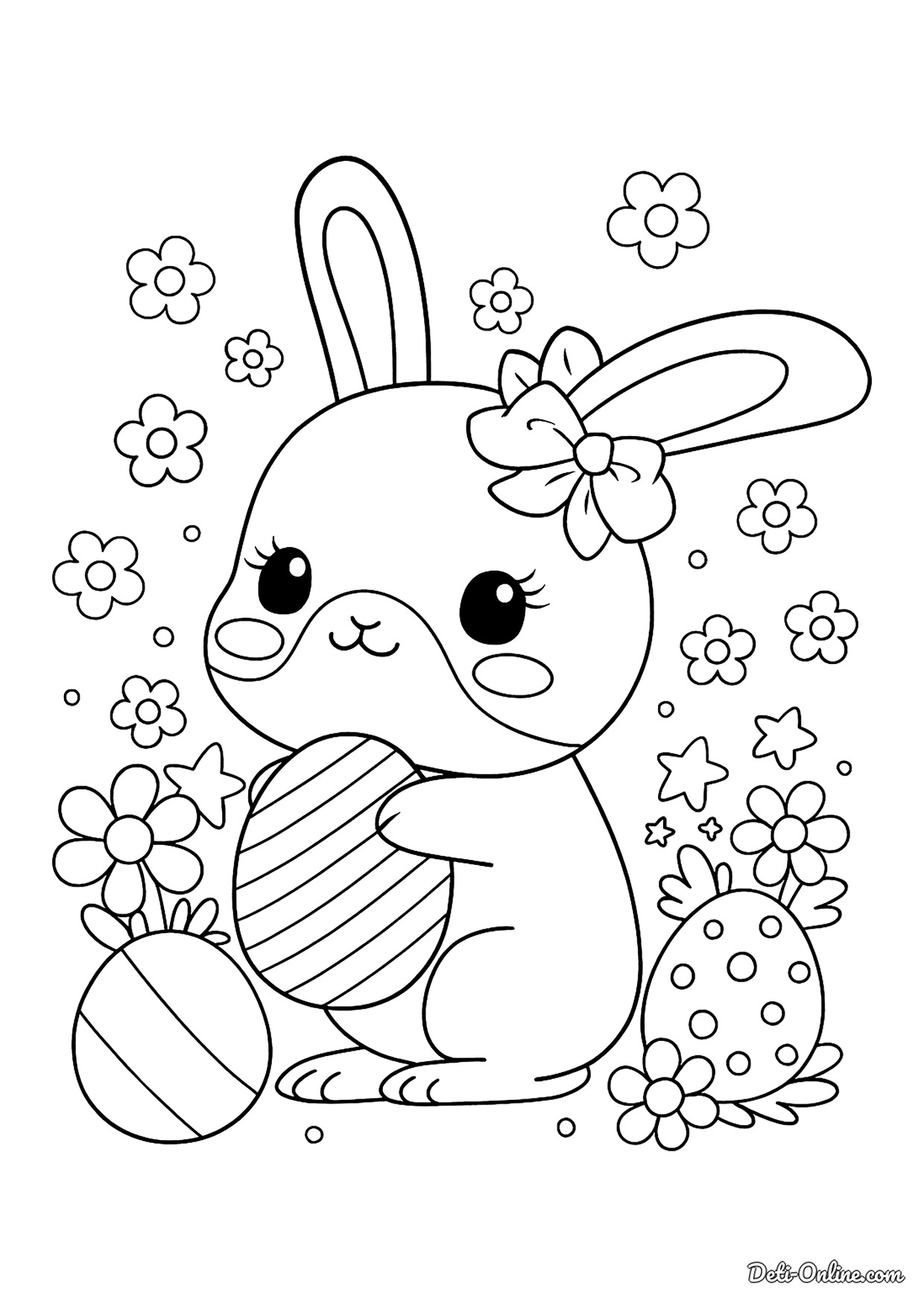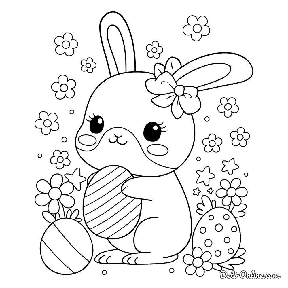 Раскраска «Пасхальный кролик с яйцами и цветами»