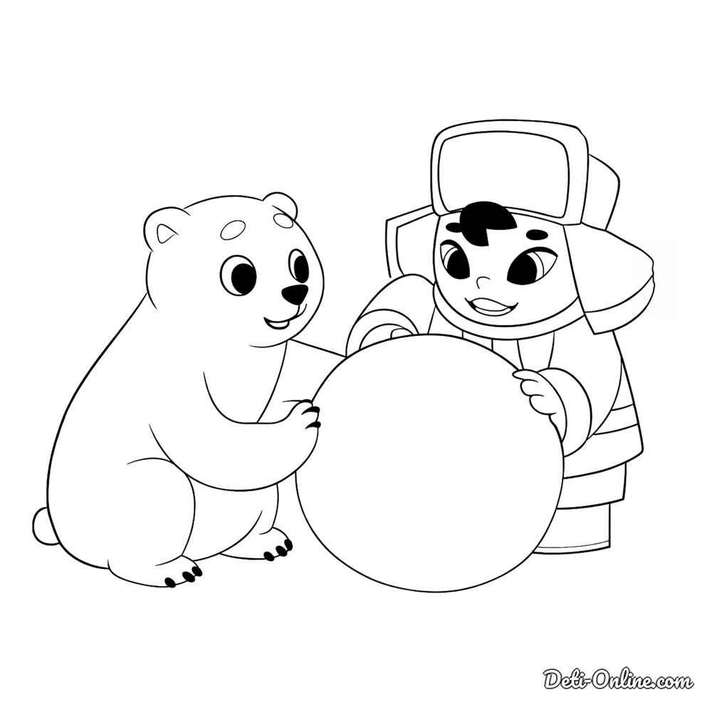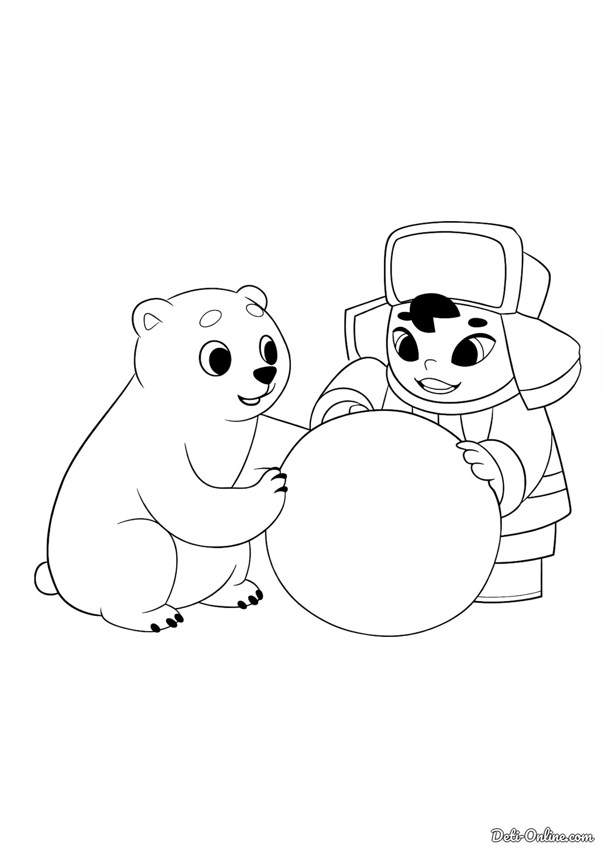 Раскраска «Умка и Тайкэ лепят снеговика»